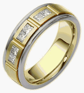 This designer two-tone band is definitely a masterpiece. 6 sparkling SI clarity, GH color round brilliant diamonds totaling 0.30 carats adorn the band. Measuring 6.5mm wide, this comfort fit band will definitely be the talk of the town. Available in your choice of 14 karat or 18 karat gold. The ultimate in craftmanship and quality. NOTE: This wedding band is custom made to order. Therefore please allow 8-10 business days to manufacture before shipment. If you have any questions, comments or would like to receive a free ring sizer, please email customer service.