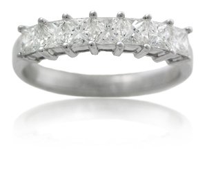 This beautiful diamond ring, designed in Italy, features 7 princess cut white diamonds of F color, VS2 clarity and excellent cut and brilliance weighing 1.00 carat total.The ring is a size 5.75 and measures approximately 4mm at the widest point.This diamond ring is sizable to most finger sizes. Some sizes may have to be special ordered and will take approximately 4-6 weeks to deliver.